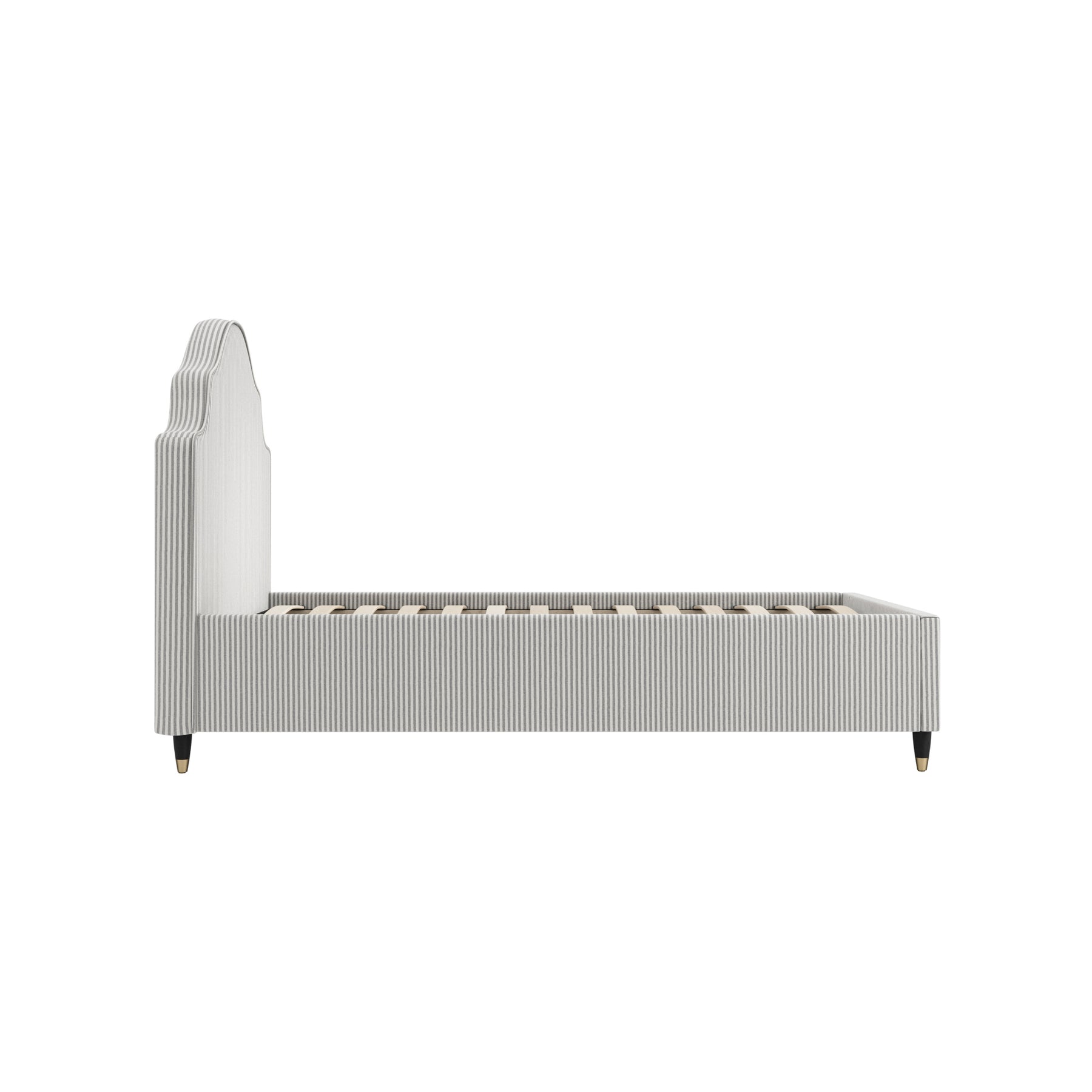 Elevate your bedroom with the Belford Grey Striped Single Bed. Crafted from a linen-blend fabric and adorned with a stylish ornate headboard, this piece is the perfect combination of comfort and style. Its subtle brass cap detailing on the legs add a touch of luxury, whilst its sprung slats provide unparalleled support and durability.