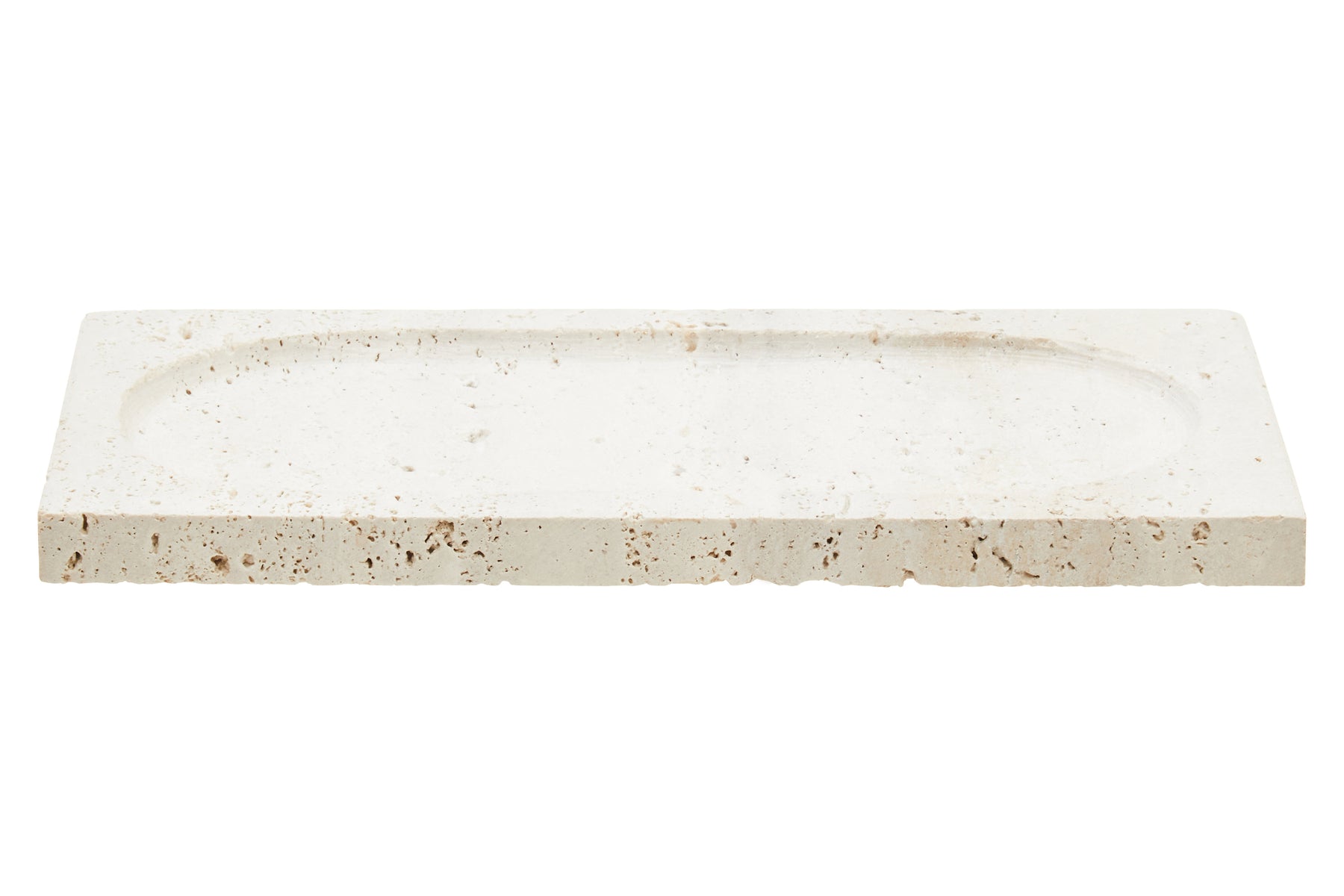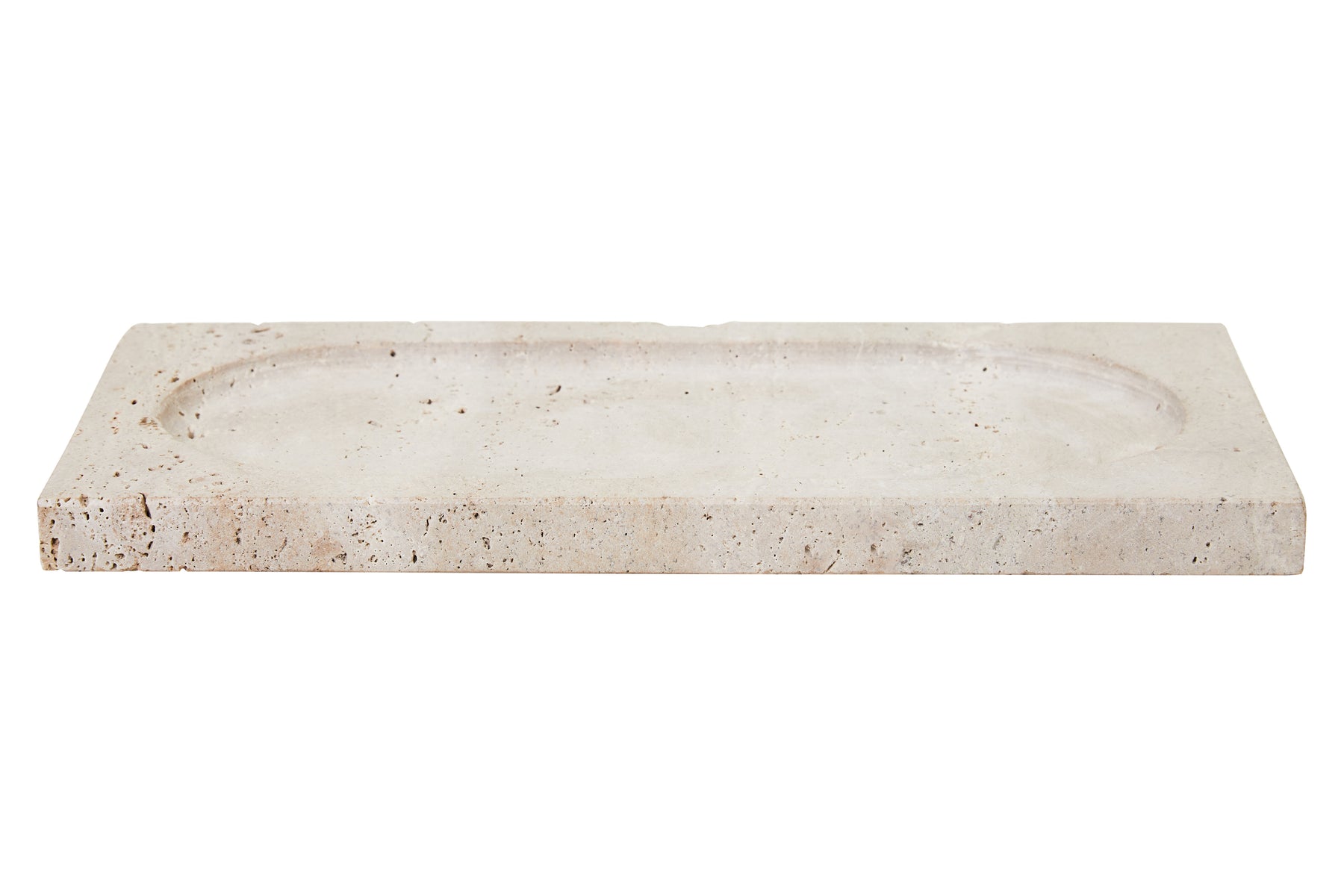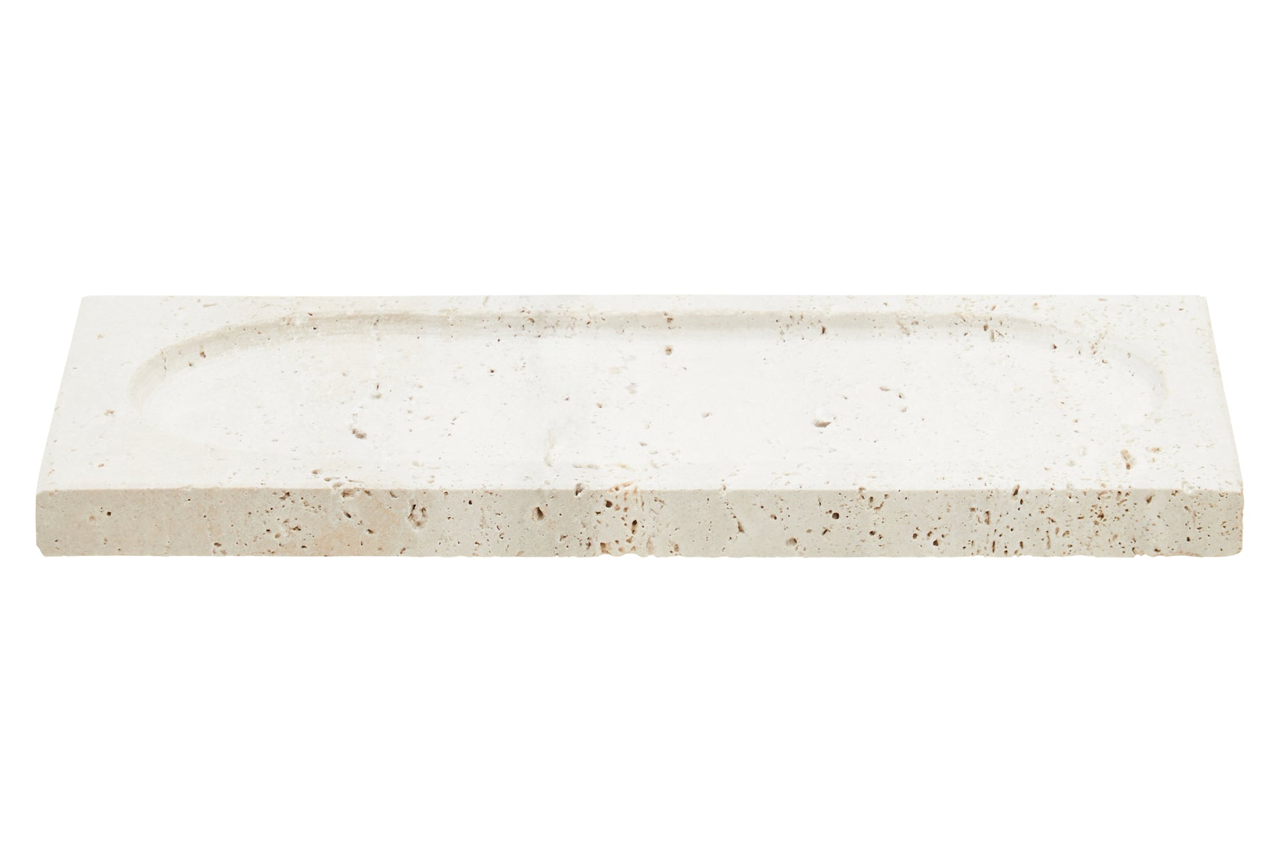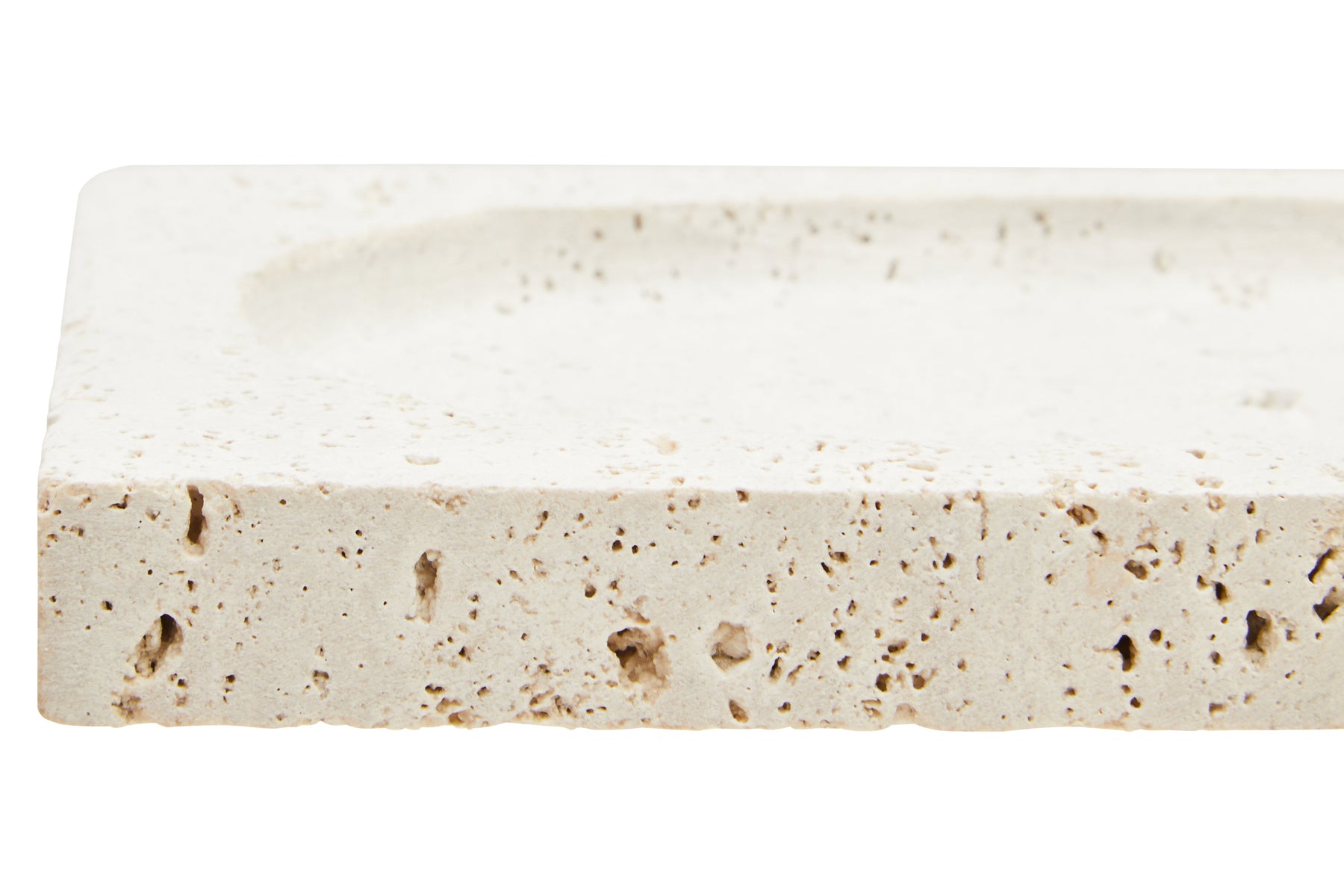 Indulge in the luxury of natural beauty with this travertine tray. Its sleek, rectangular design and unique, fibrous texture add a touch of sophistication to any surface.