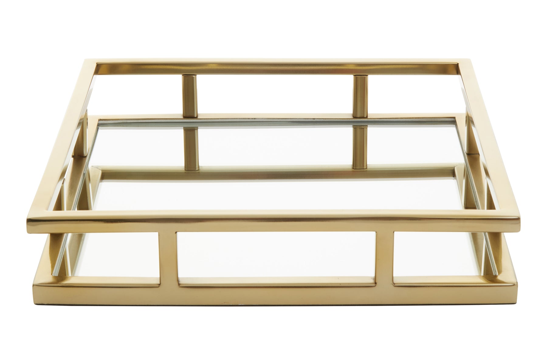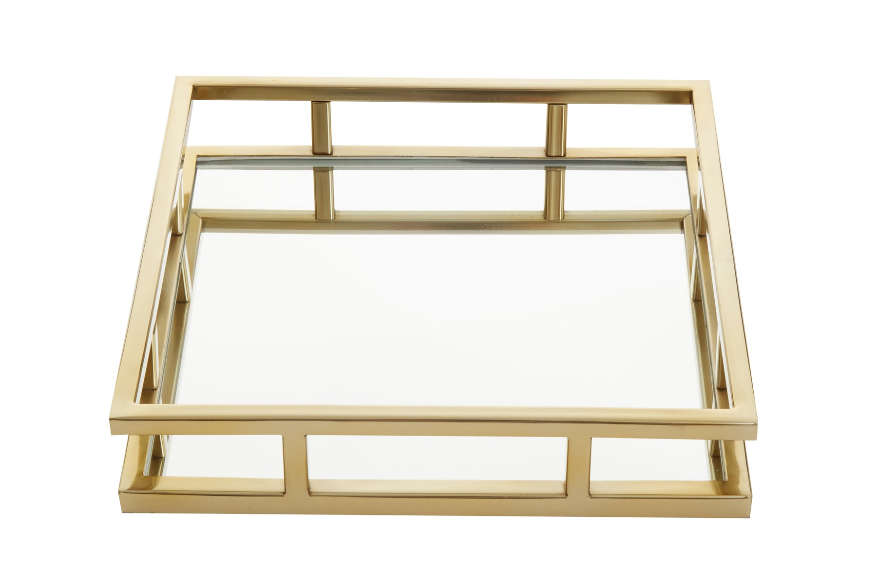 Sleek and stylish, this square tray boasts clean lines and a warm metallic accent. Its mirrored bottom adds a touch of glamour, making it ideal for displaying decorative items or serving drinks and snacks.