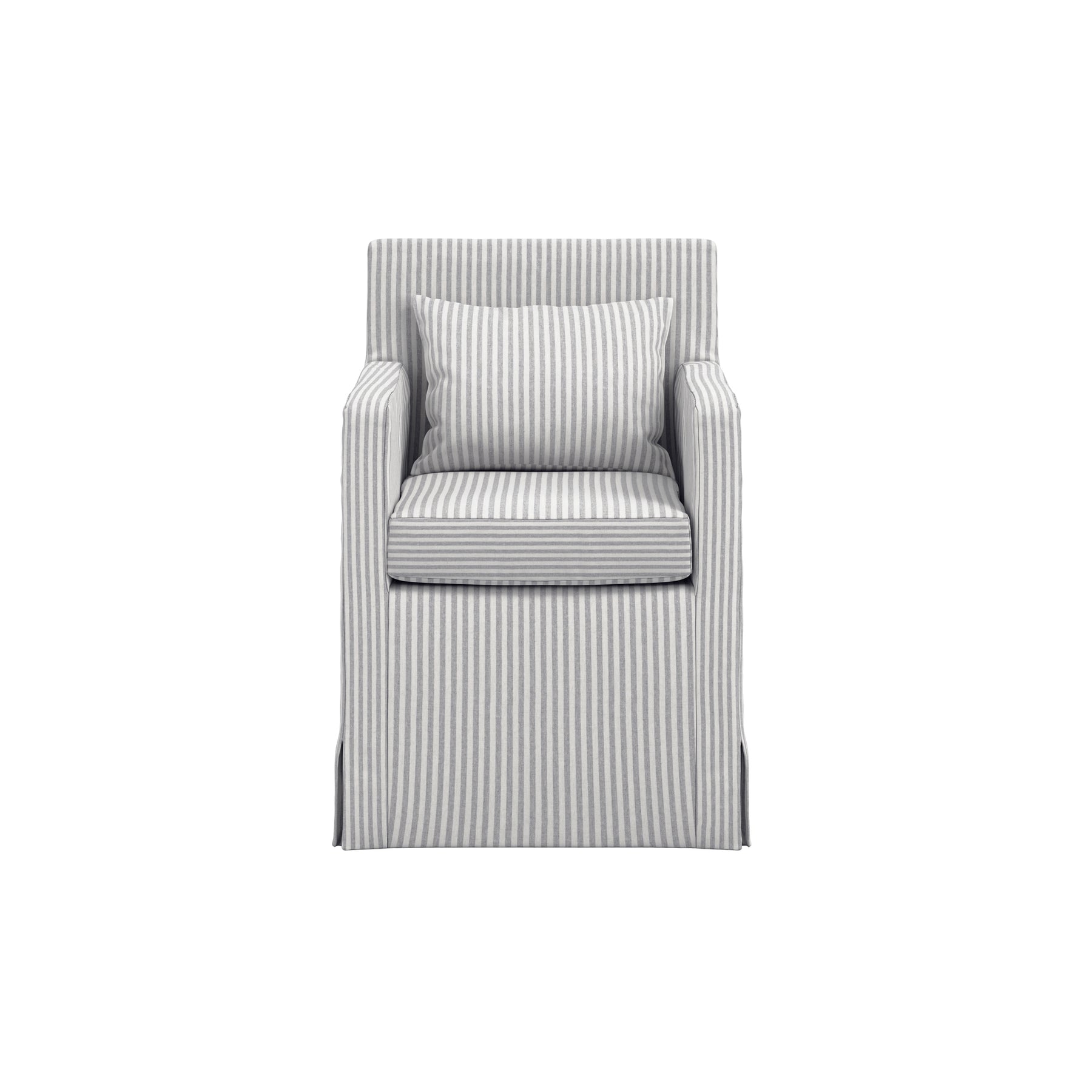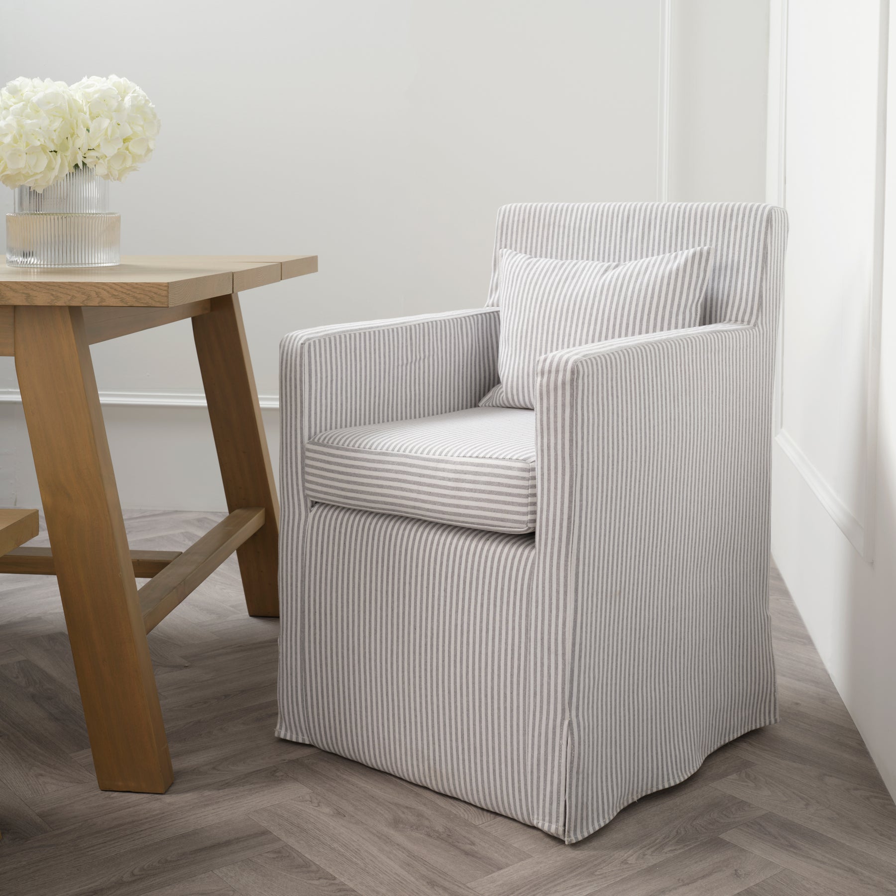 Elevate your dining room with the Belford Grey Striped Chair, crafted from a luxurious cotton-blend fabric and a stylishly designed skirt. With ample seating space, comfortable armrests, and a plush cushion, this chair offers the utmost comfort and luxury. Additional decorative cushion is also included to finish the set.