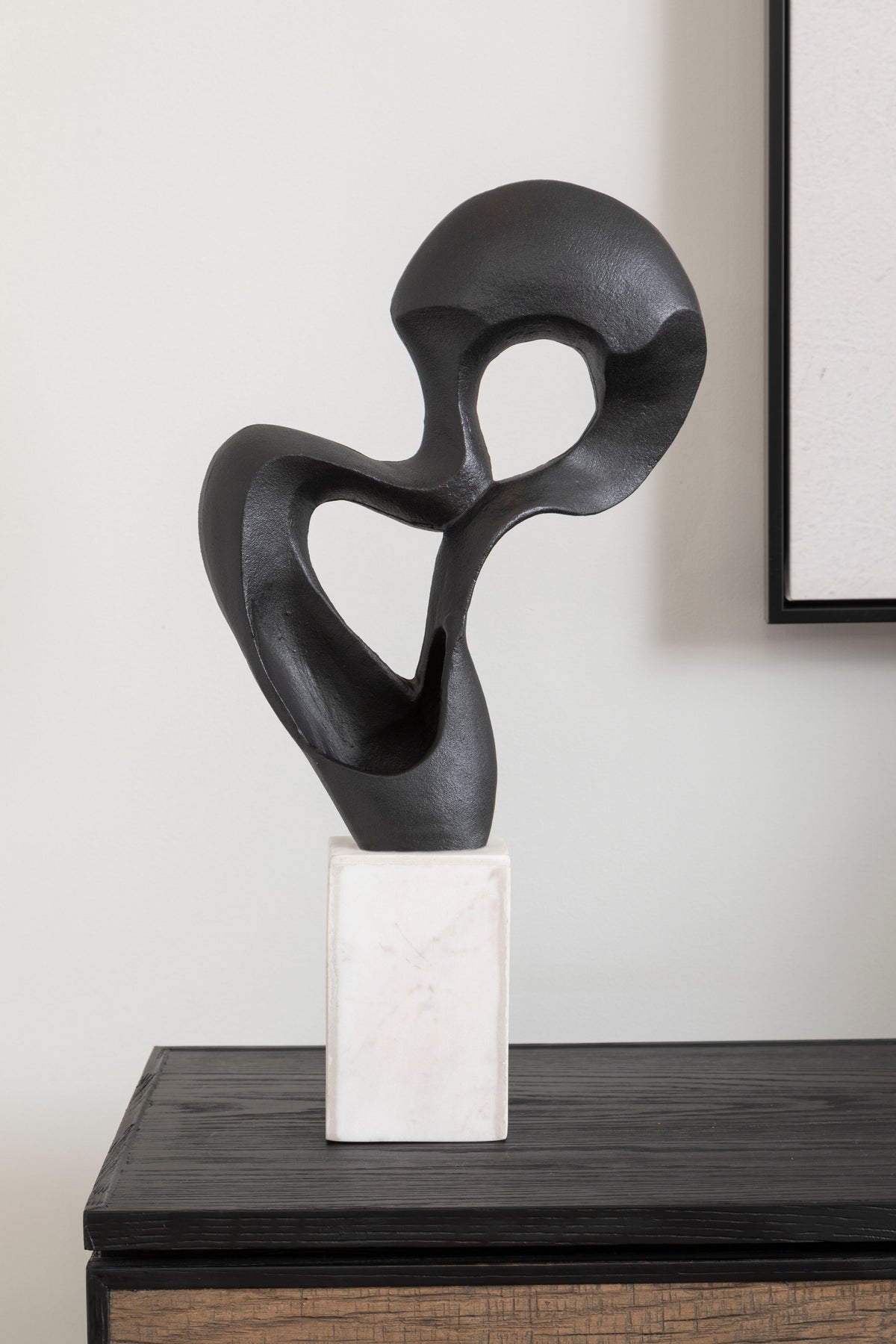 The Desio Knot Sculpture is a captivating piece of art, crafted from high-quality aluminium and finished in a sleek matte black tone. The intricate knot design, created through a skilled hand-crafting process, features a unique textured surface that adds depth and character. Mounted on a natural white marble base, each sculpture is one-of-a-kind, showcasing the beauty of natural materials.