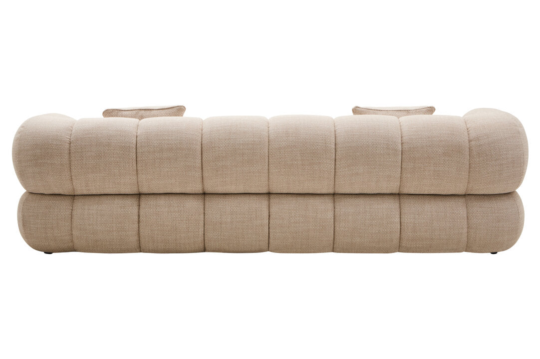 The Alzano three seat sofa features decorative channel detail and soft cream linen upholstery, making it a comfortable and stylish addition for modern homes.