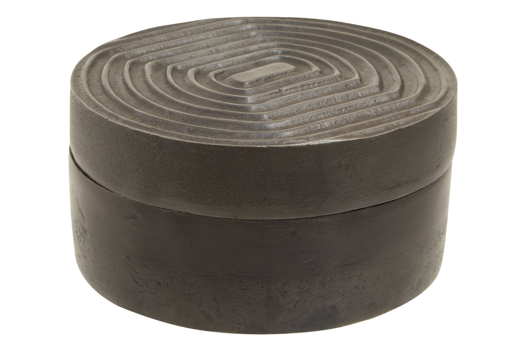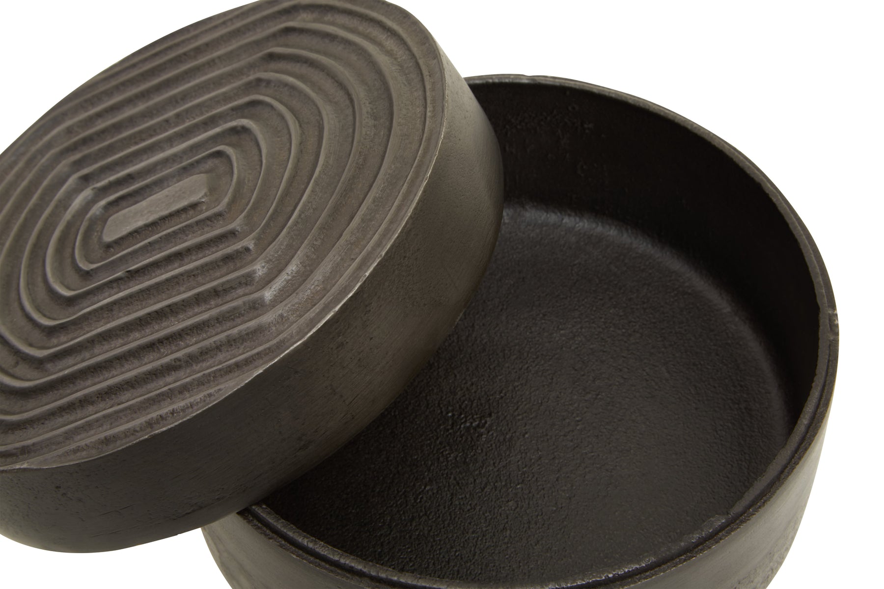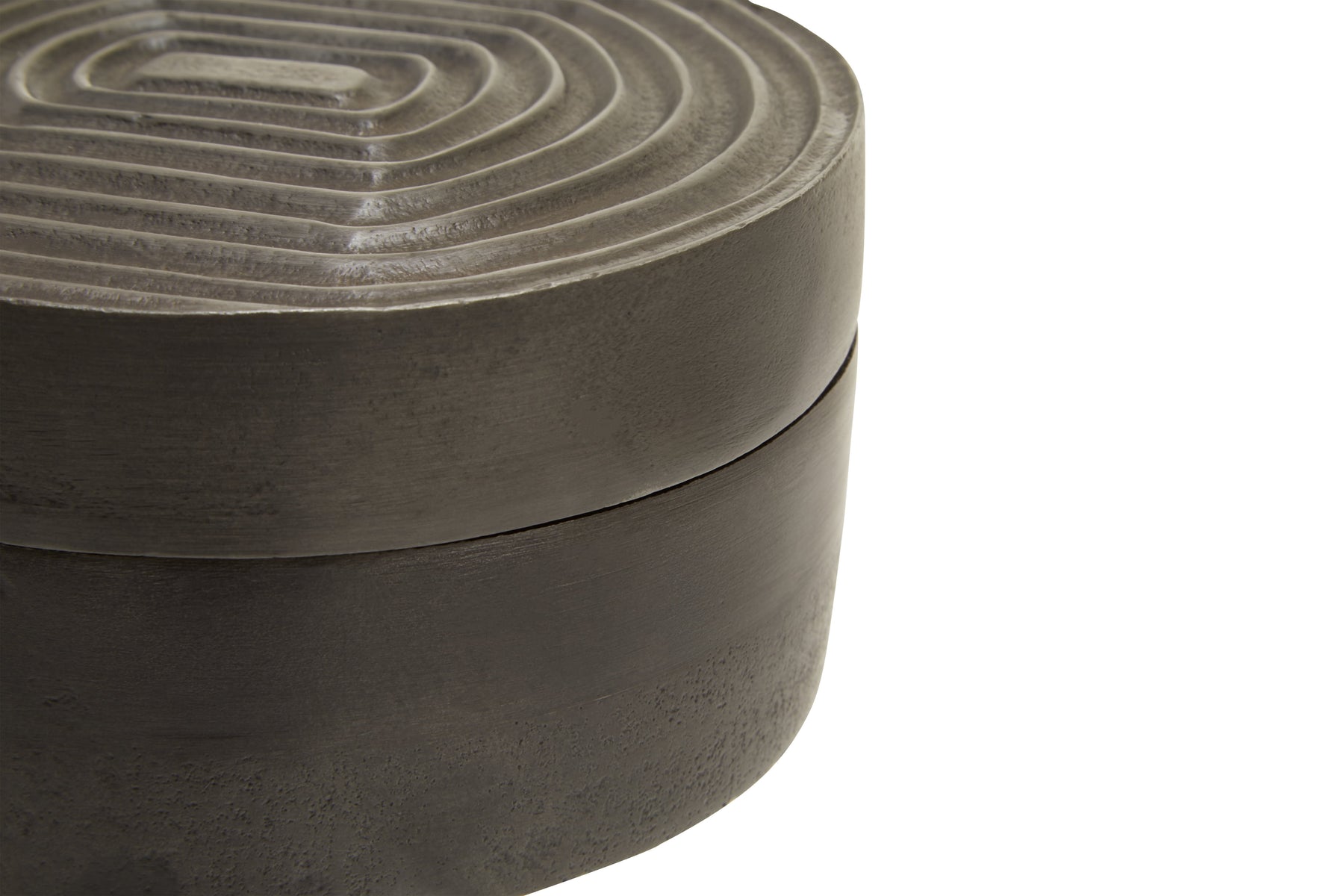 Crafted from sturdy aluminium, this compact box boasts a sleek grey finish. Its removable lid is adorned with captivating details.