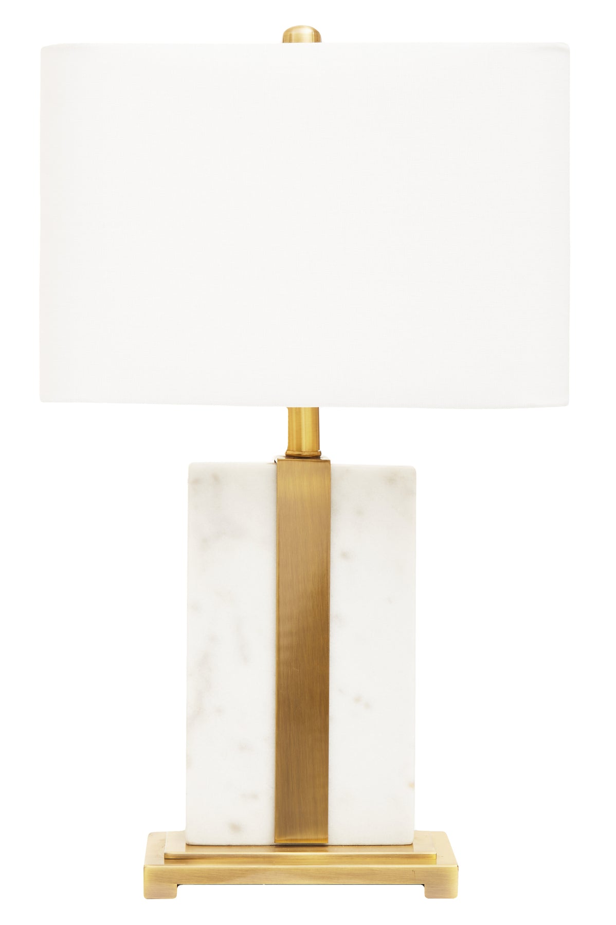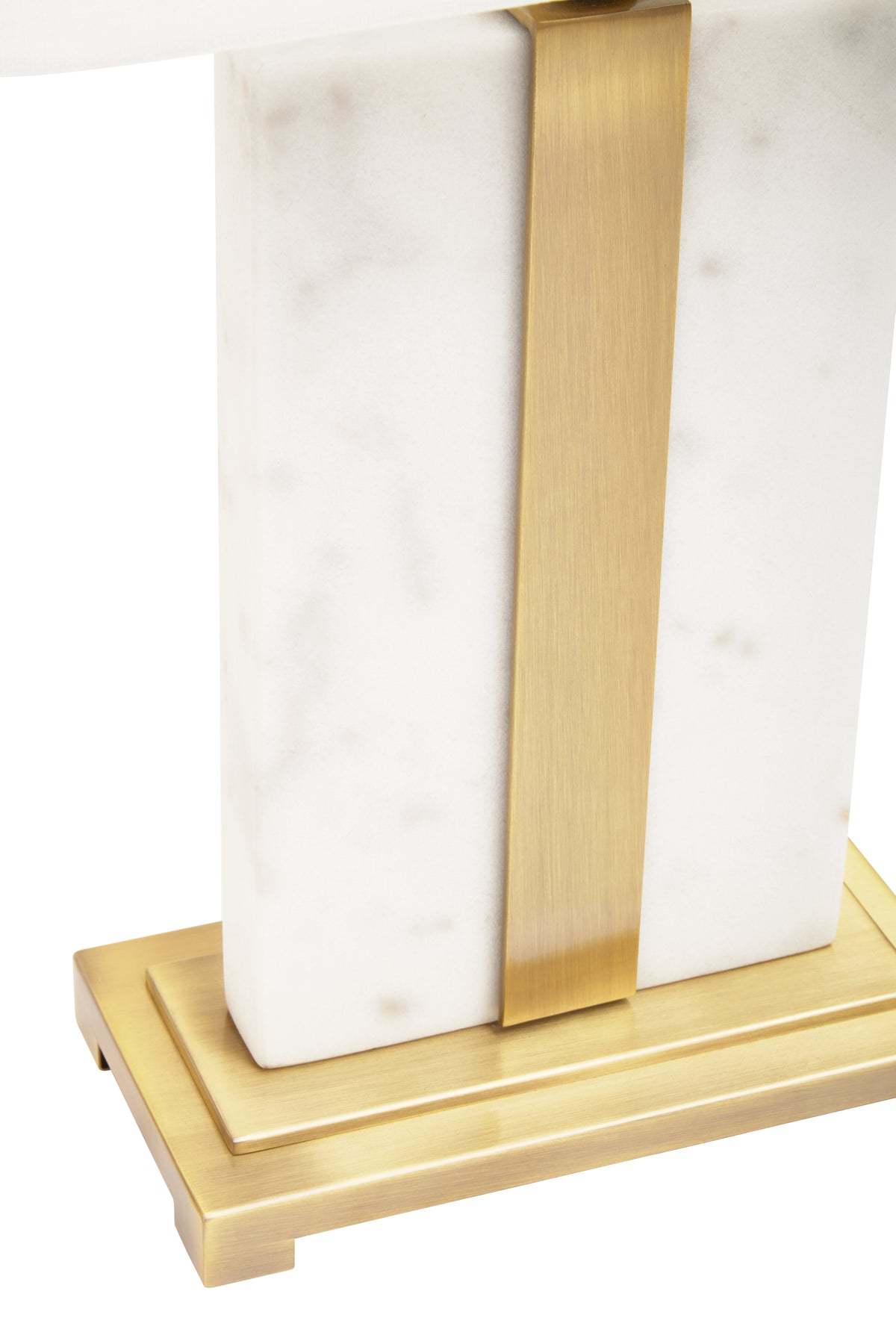 Make a statement with the Bergamo table lamp. Its unique design combines a sleek marble column, an ivory shade, and a luxurious brushed gold base. This versatile lamp can complement a variety of interior styles, from modern to traditional.